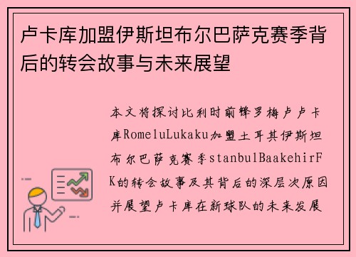 本文将探讨比利时前锋罗梅卢·卢卡库(Romelu Lukaku)加盟土耳其伊斯坦布尔巴萨克赛季(İstanbul Başakşehir FK)的转会故事及其背后的深层次原因,并展望卢卡库在新球队的未来发展。卢卡库的转会是一个充满戏剧性的转折,标志着他职业生涯的一个新篇章。这篇文章将从四个方面展开,首...