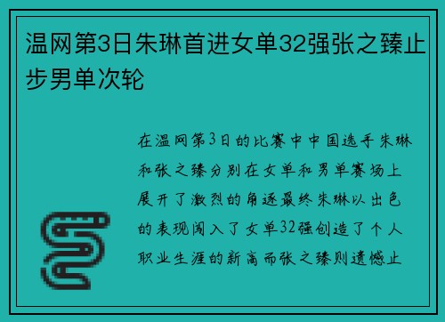 在温网第3日的比赛中,中国选手朱琳和张之臻分别在女单和男单赛场上展开了激烈的角逐。最终,朱琳以出色的表现闯入了女单32强,创造了个人职业生涯的新高,而张之臻则遗憾止步于男单次轮。这一喜一忧的局面不仅引发了广泛的关注,也让人们对中国网球的未来充满了更多期待与憧憬。 朱琳,这位来自中国的年轻女将,一直以...